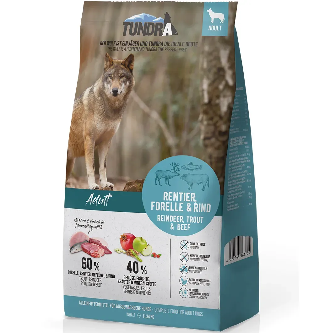 Tundra on põhjapoolne maastik Arktika ringkonnas ulatuslike boreaalsete metsadega (taigad), kus hundid on oma instinktidest juhituna juba sajandeid vabalt ringi jooksnud. Nad rändavad läbi laiade maastike ja jahivad koos karjas. TUNDRA tootevaliku väljatöötamisel on keskendutud rangelt sellele, milline toitumine on bioloogiliselt liigile sobiv ja toitumisfüsioloogia seisukohalt huntide saagile lähim. TUNDRA toidud on tasakaalustatud ja ilma teraviljadeta. Kasutatakse ainult parimaid koostisosasid: rohkesti toidukvaliteediga värsket liha ja kala, kaunvilju, puu- ja köögivilju. Neist valmistatakse õrnatoimelise tootmisprotsessi käigus lemmikloomale sobiv toitaineliselt tasakaalustatud ja hästi vastuvõetav toit.