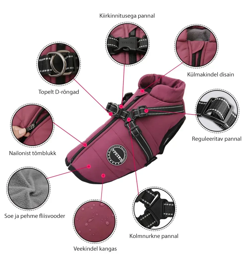 - Koera talvejopel on soe ja pehme fliisvooder ja täidis, mis kaitseb hästi külma eest.