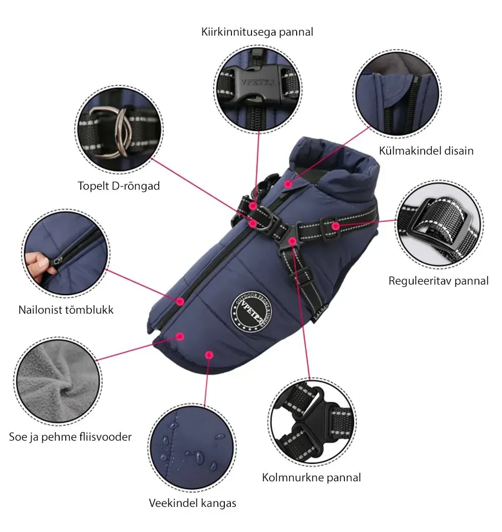 - Nailonist tõmbluku abil saab koera jope lihtsasti selga panna ja seljast ära võtta.