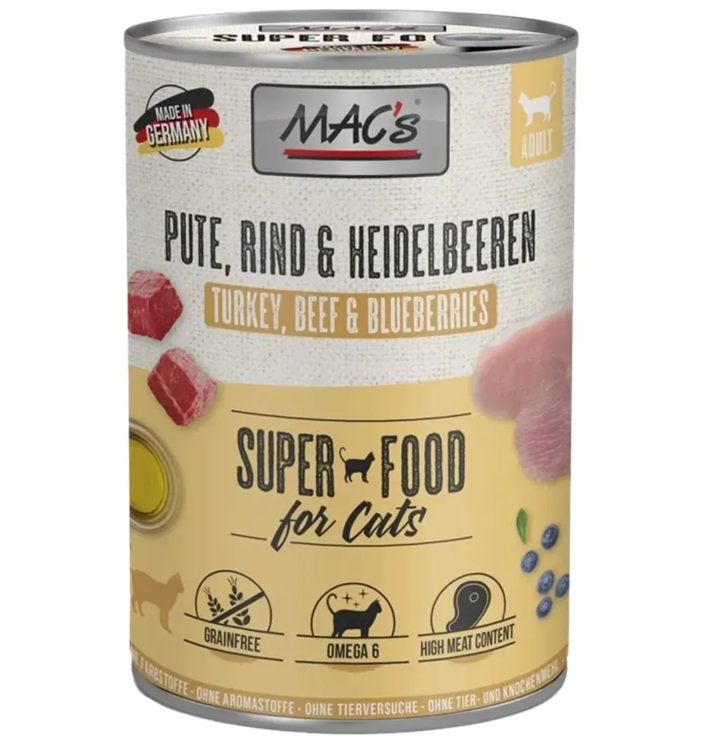 MAC's konserv kassile KALKUNI-, VEISELIHA ja MUSTIKATEGA teraviljavaba (Superfood MACs Cat Turkey & Blueberries)
