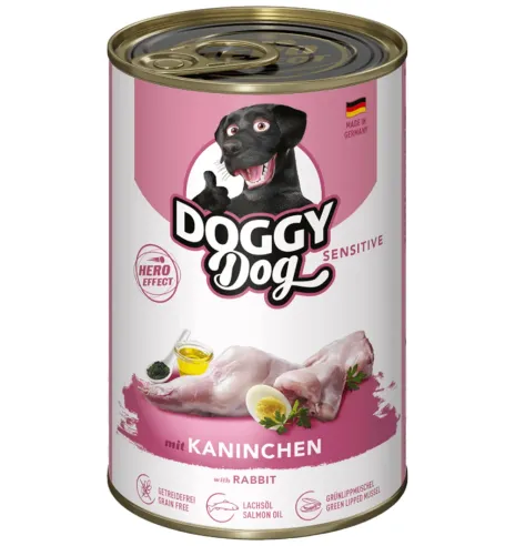 DOGGY Dog Sensitiv Rabbit konservtoit on hea valik tundliku kõhuga koertele tänu eriti väherasvasele ja kergesti seeditavale jäneselihale. Lisaks paljudele valkudele varustab see teie lemmiklooma ka oluliste mineraalainetega nagu raud, B-vitamiinide ja aminohapetega.