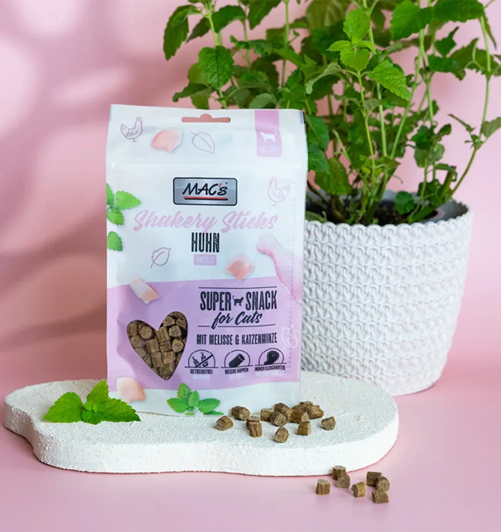 Pehmed maiused MAC’s Shakery Sticks Chicken sobivad suurepäraselt kanaliha armastavatele kassidele! Rohke värske liha teeb neist teraviljavabadest snäkkidest ideaalse valiku klikkertreeninguks ja vahepalaks toidukordade vahel. Kasulikud supertoidud meliss ja naistenõges (catnip) võivad toetada seedimist ning avaldada rahustavat mõju, aidates kassil paremini toime tulla nii igapäevaelu kui ka stressiolukordadega. Tõeliselt super maius sinu lemmikule!