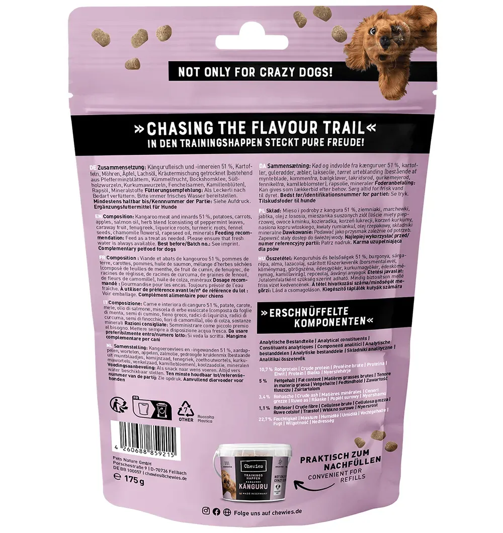 Chewies treeningmaius kängurulihaga on erakordselt maitsev amps ja sobib hästi ka koertele, kes on toidu suhtes tundlikud või allergiaga. Känguruliha on nende koostises ainus loomse valgu allikas. Lisaks on selles võrratult maitsevasse ampsu lisatud kartul, porgand, õunad, mitmed maitsetaimed, õlid ja mineraalained. Puhas tervis!
