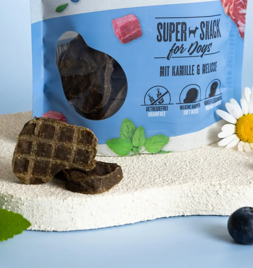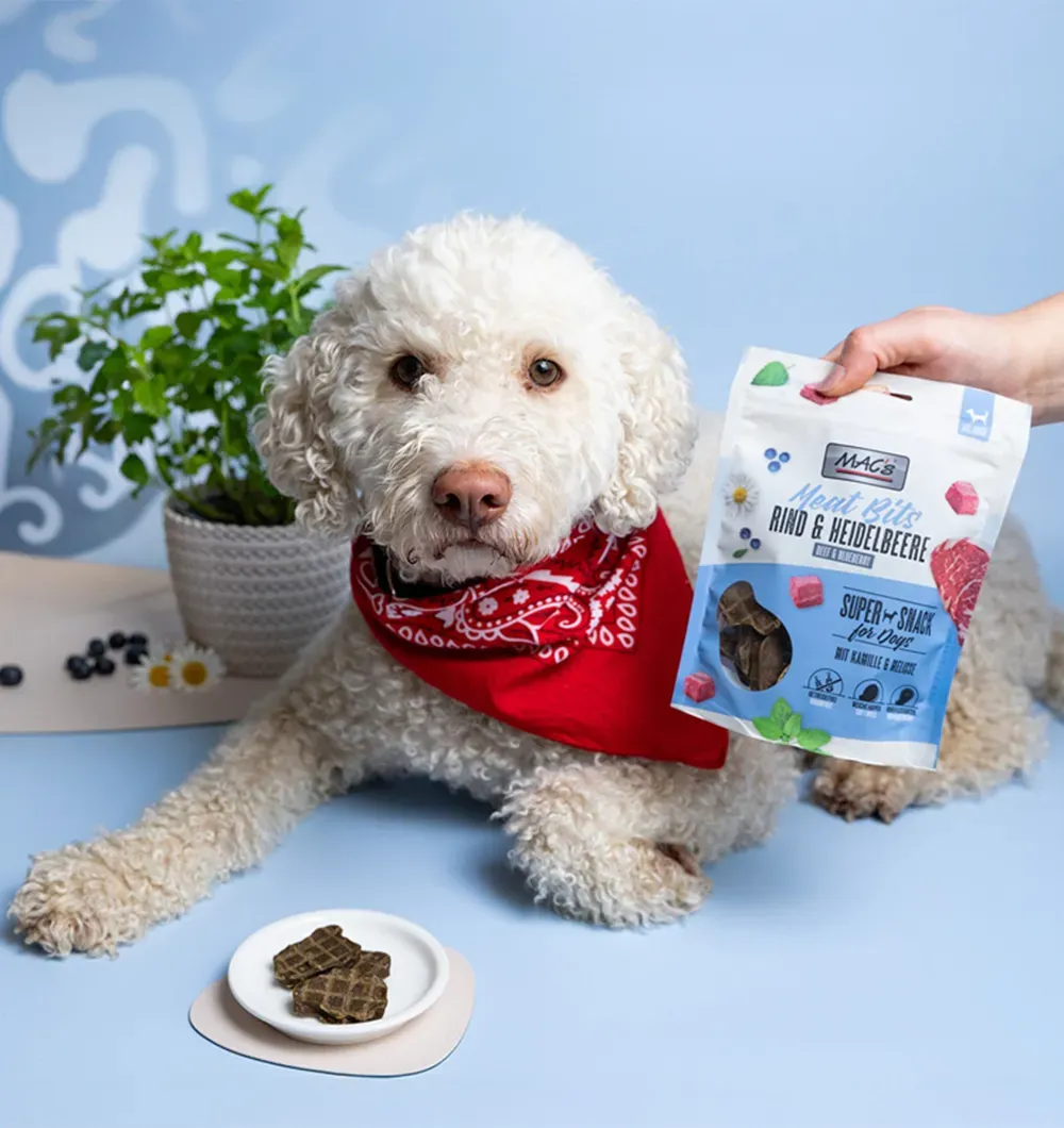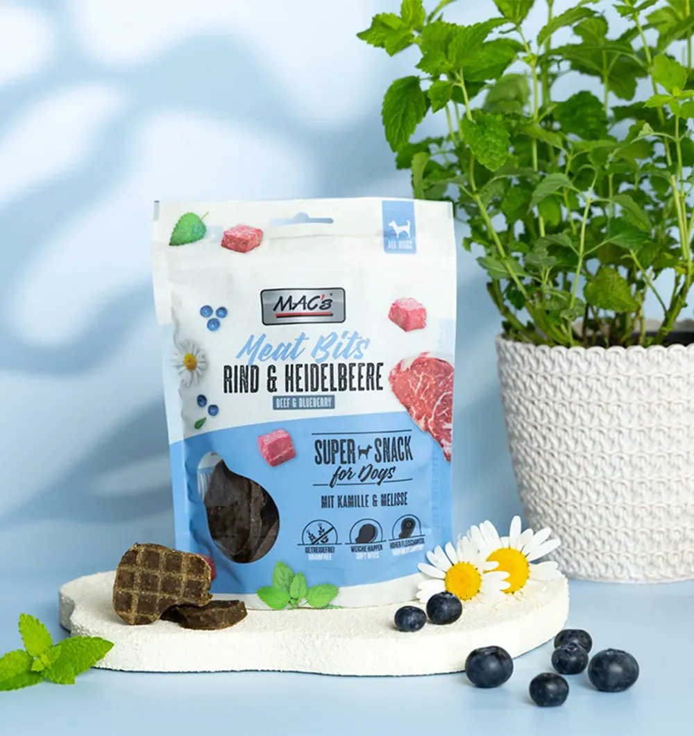 Pehmed maiused neljajalgsetele gurmaanidele: MAC’s Meat Bits Beef & Blueberry pakub koerale erilist maitsekooslust. Erti värske liha ja mahlased mustikad teevad sellest pehmest maiusest ideaalse valiku treeninguks või vahepalaks toidukordade vahel. Kasulikud supertoidud kummel ja meliss võivad toetada sinu koera seedimist ning mõjuda rahustavalt. Need aitavad su lemmikul paremini toime tulla igapäevaelu ja stressiga. Tõeliselt super maius sinu neljajalgsele sõbrale!