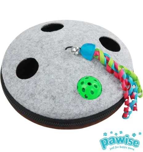 Внутри игрушки находится мячик, которым кошка может играть через отверстия в крышке.