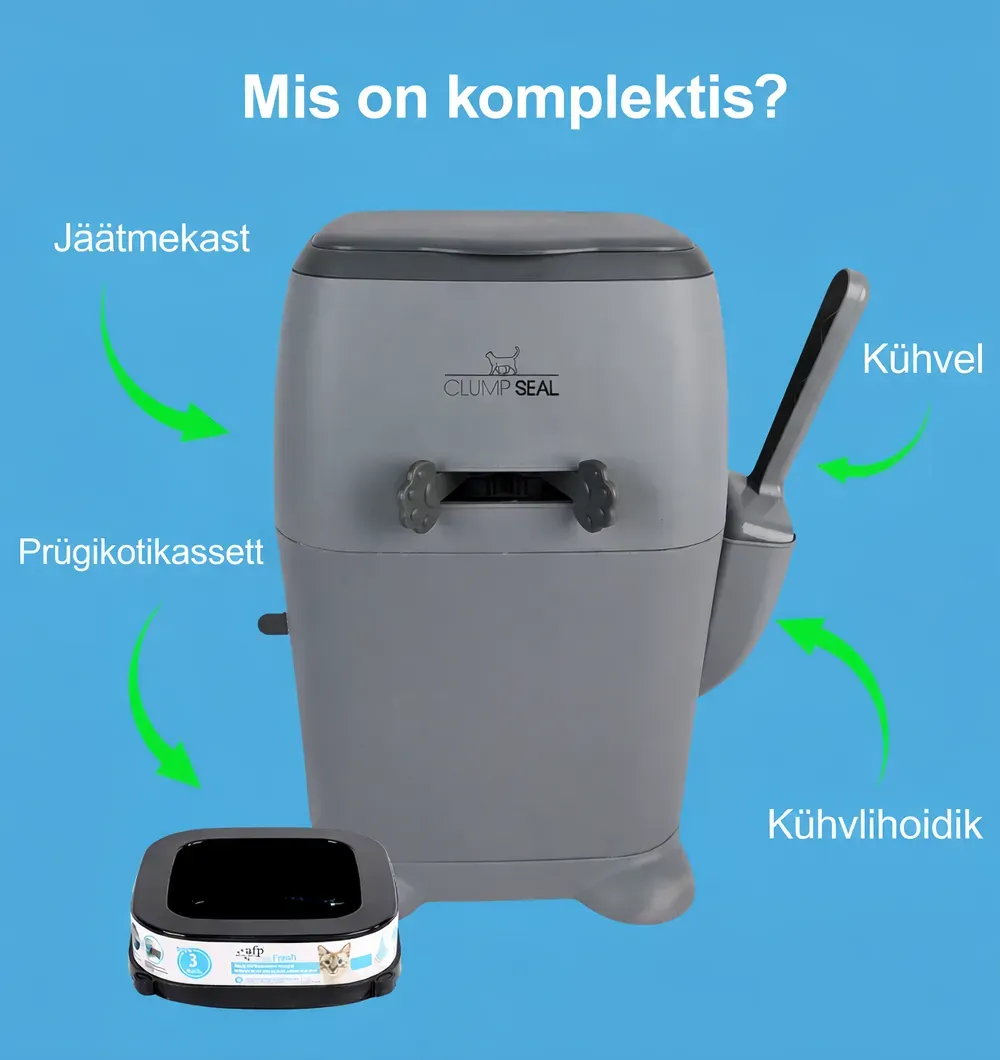 В комплект входят совок для кошачьего наполнителя с магнитным держателем и одна кассета для мусорных пакетов (1 x 6,5 м, непрерывный рулон плёнки).