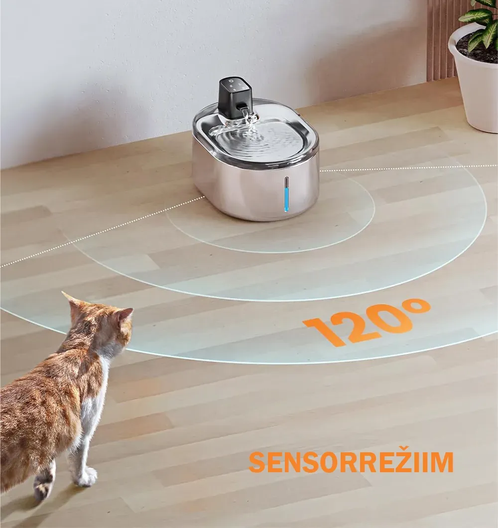 - Сенсорный режим – когда питомец подходит на расстояние до 80 см, фонтан включается и подаёт воду в течение 15 секунд.