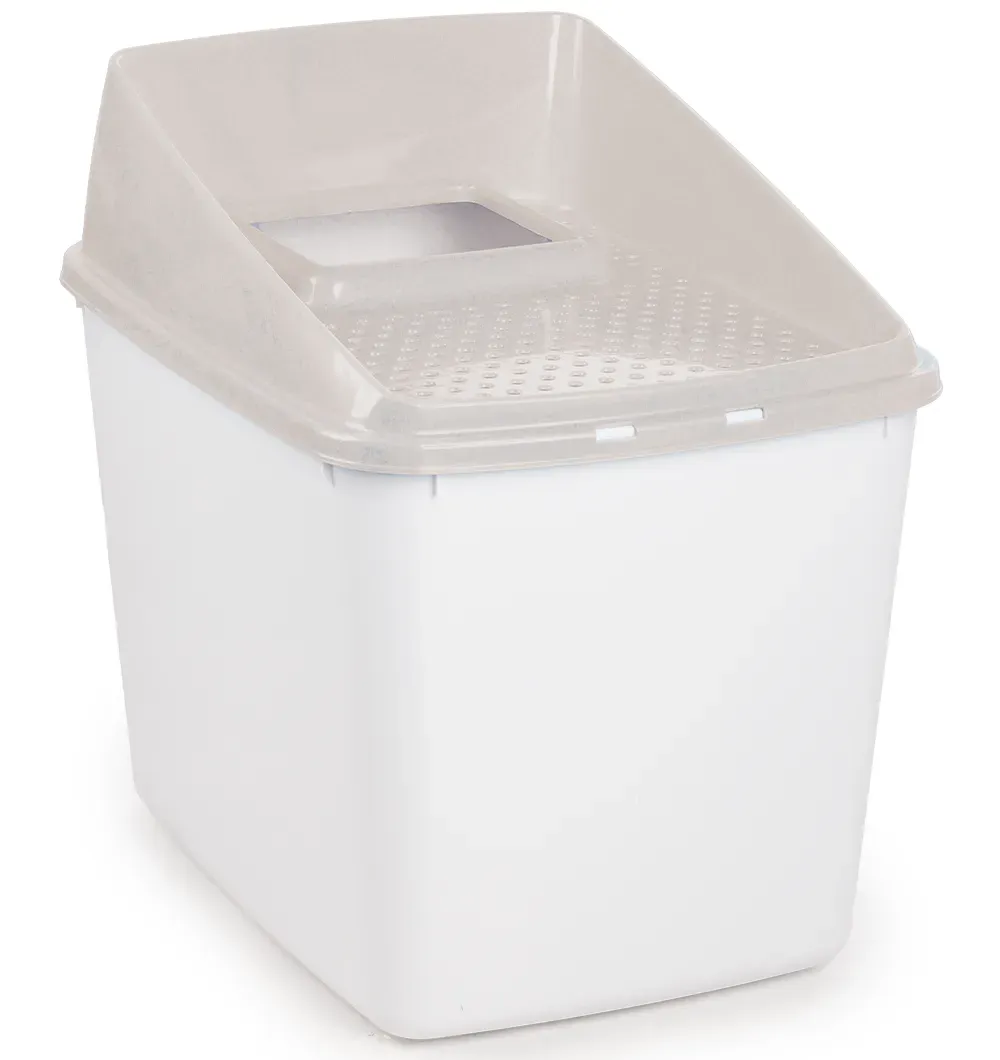 Кошачий туалет с верхним входом типа Hop-In, верхняя крышка с перфорированной поверхностью улавливает песчинки, прилипшие к лапам кошки и поддерживает чистоту вокруг лотка.