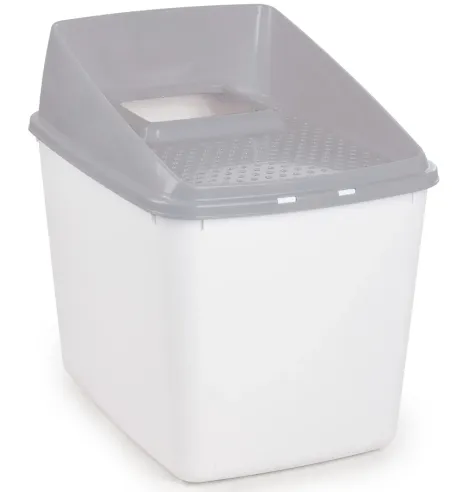 Кошачий туалет с верхним входом типа Hop-In, верхняя крышка с перфорированной поверхностью улавливает песчинки, прилипшие к лапам кошки и поддерживает чистоту вокруг лотка.