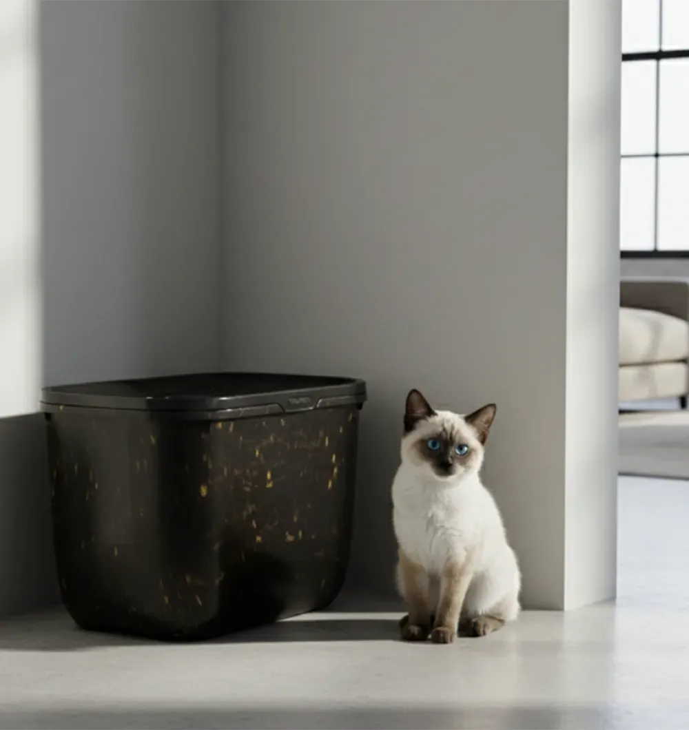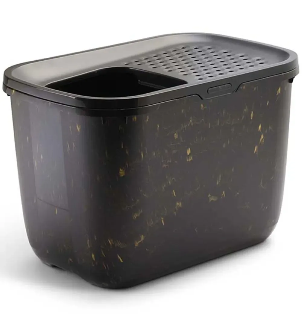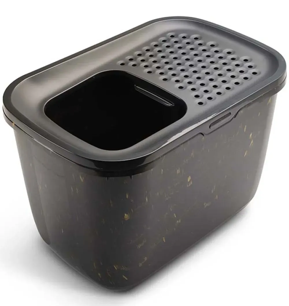 Размещение туалета Hop In в углу экономит место и заставляет кошку дольше проходить по крышке с небольшими отверстиями, прежде чем спрыгивать.