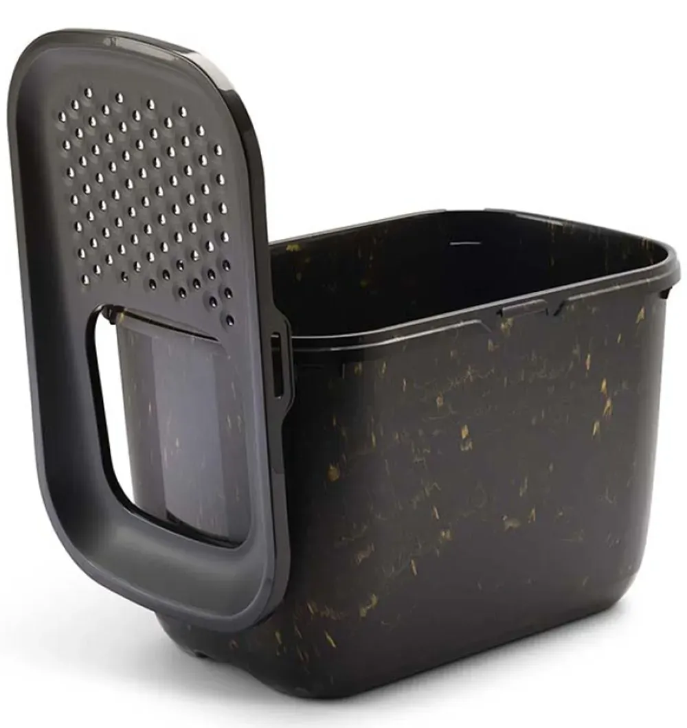 Самая важная деталь в песочнице Hop In — перфорированная, слегка наклоненная внутрь крышка. Когда кошка выходит из домика по крышке с маленькими отверстиями, частицы наполнителя падают обратно в лоток через отверстия. Так территория вокруг песочницы остается чистой.