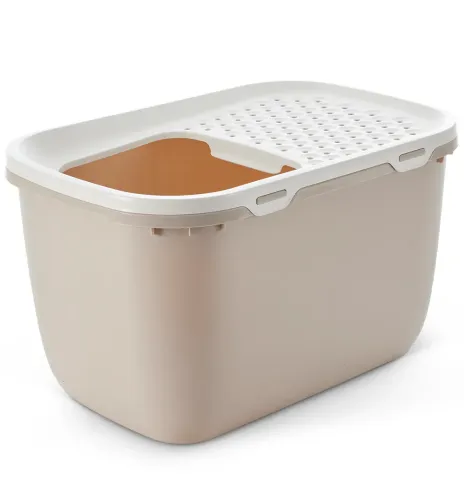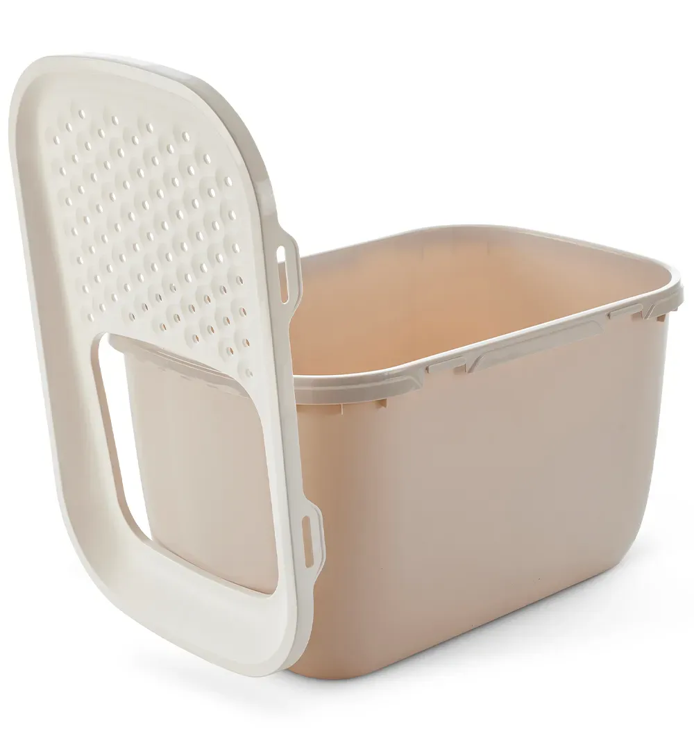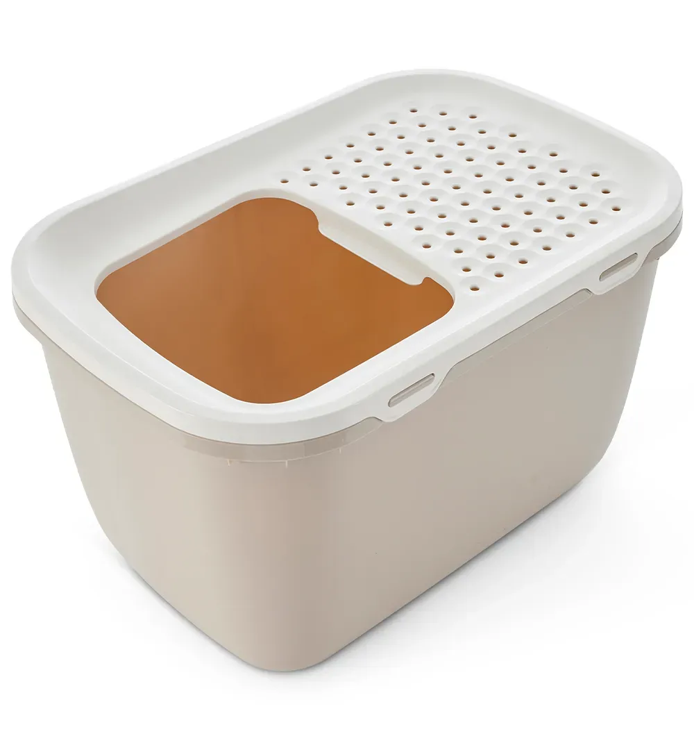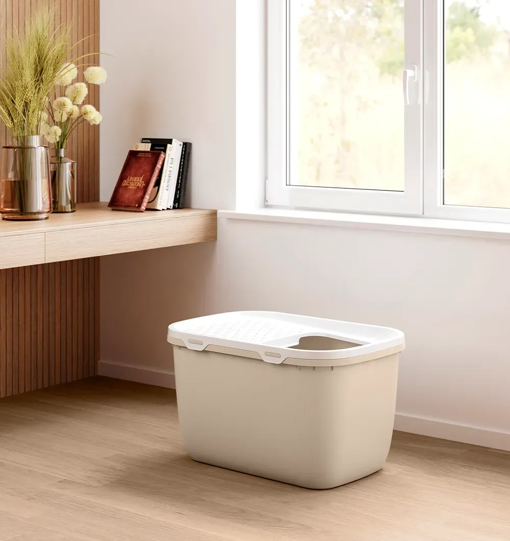 Большое отверстие в крышке позволяет кошке свободно входить и выходить из домика. Ежедневная уборка туалета-домика проста. Верхнюю крышку можно снять и повесить во время уборки сбоку.