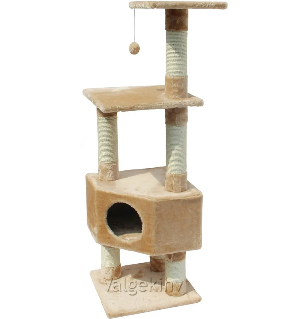 Когтеточка на столбиках, с лежанками и спальным местом-домиком, с подвесной игрушкой (шариком).