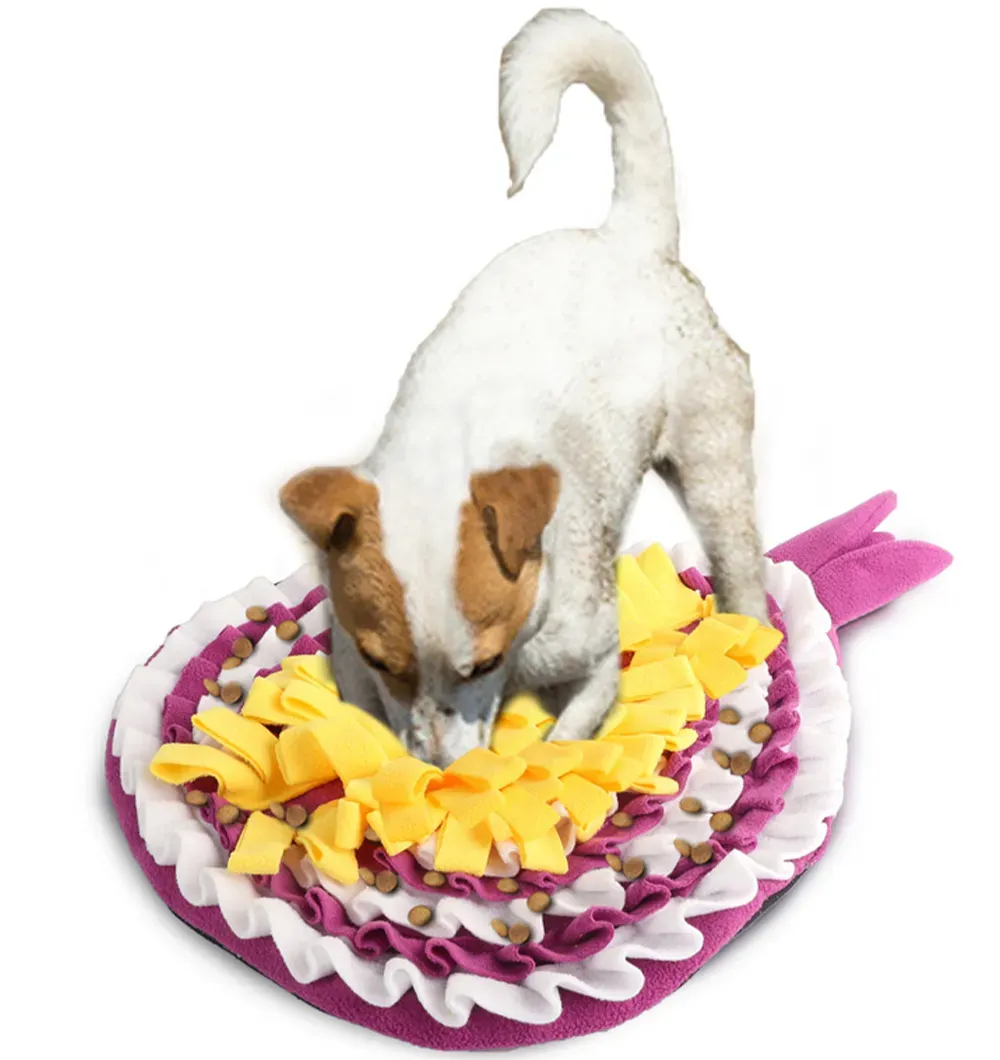 - Положите лакомство или сухие крекеры на коврик для обнюхивания. Пусть собака их найдет и «выкопает».