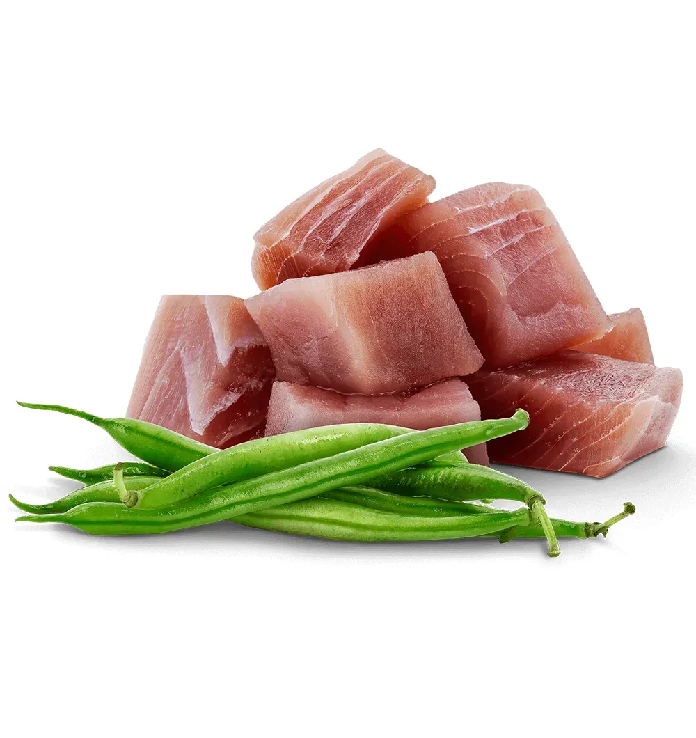 Мясо и производные животного происхождения (76% в кусках, из которых 14% курица*), рыба и производные рыбы (12% тунец в кусках*), минералы, гороховый крахмал, лигноцеллюлоза, гороховый белок, зеленая фасоль (сушеная) 0,45%, инулин из цикория 0,4%, подсолнечное масло.