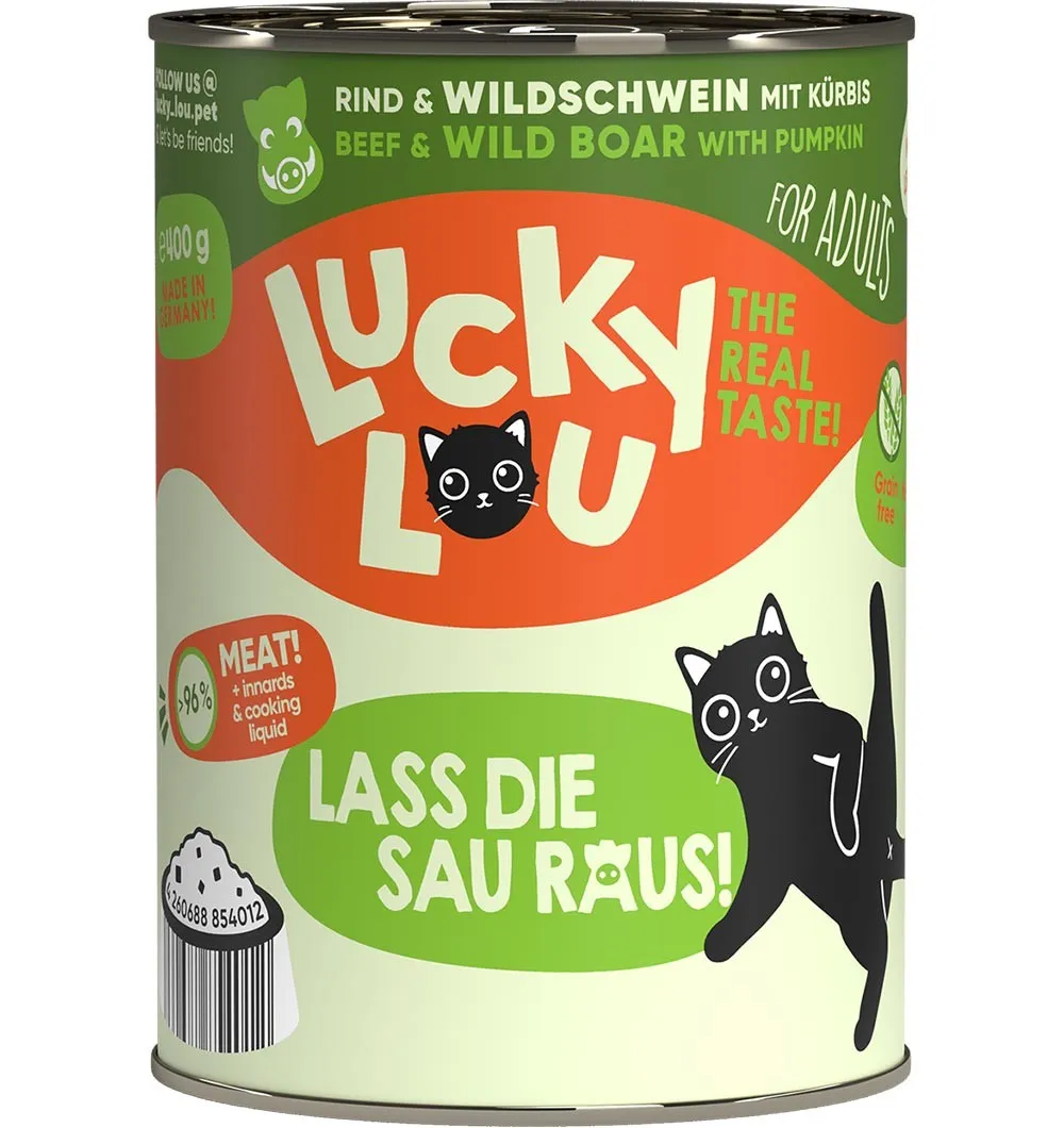 Говядина 60% (сердце, мясо, печень, легкие), бульон из говядины и кабана 26,8%, мясо кабана 10%, тыква 2%, минералы 1%, масло вечерней примулы 0,2%.