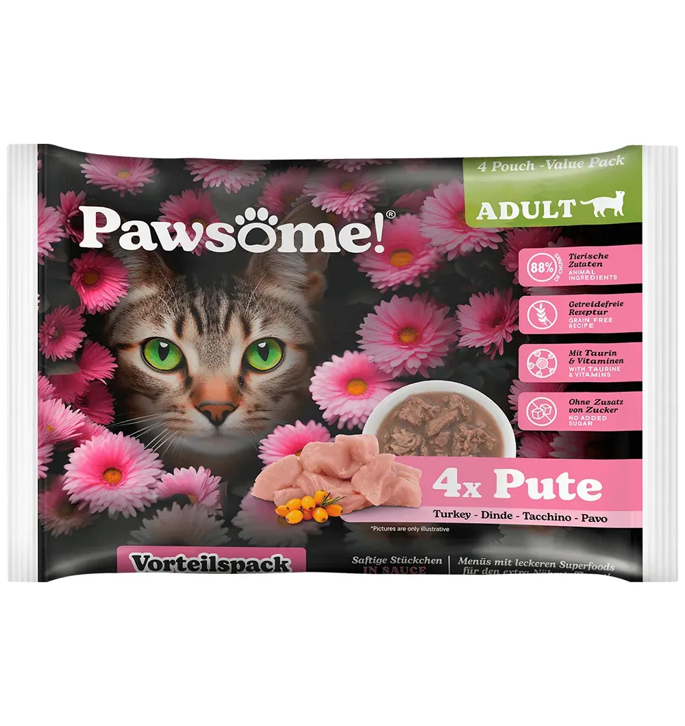 Pawsome! консервированный корм для кошек в пакетике, кусочки индейки в соусе, беззерновой
