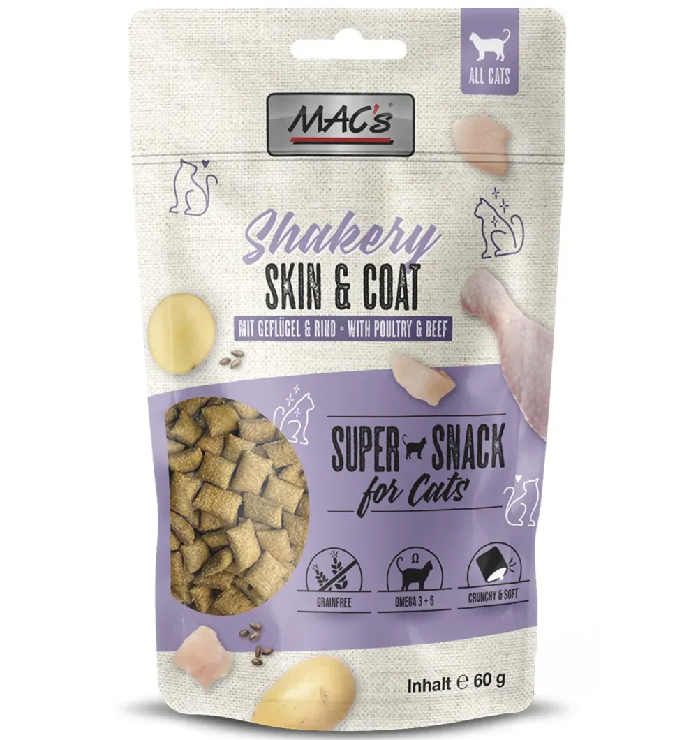 MAC's Shakery Skin & Coat хрустящие подушечки, со сливочной начинкой из птицы и говядины. Поддерживает здоровье кожи и шерсти кошки.