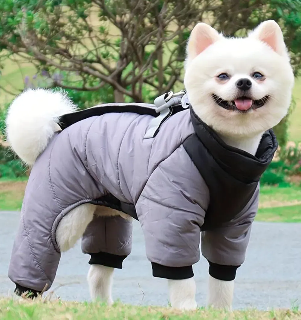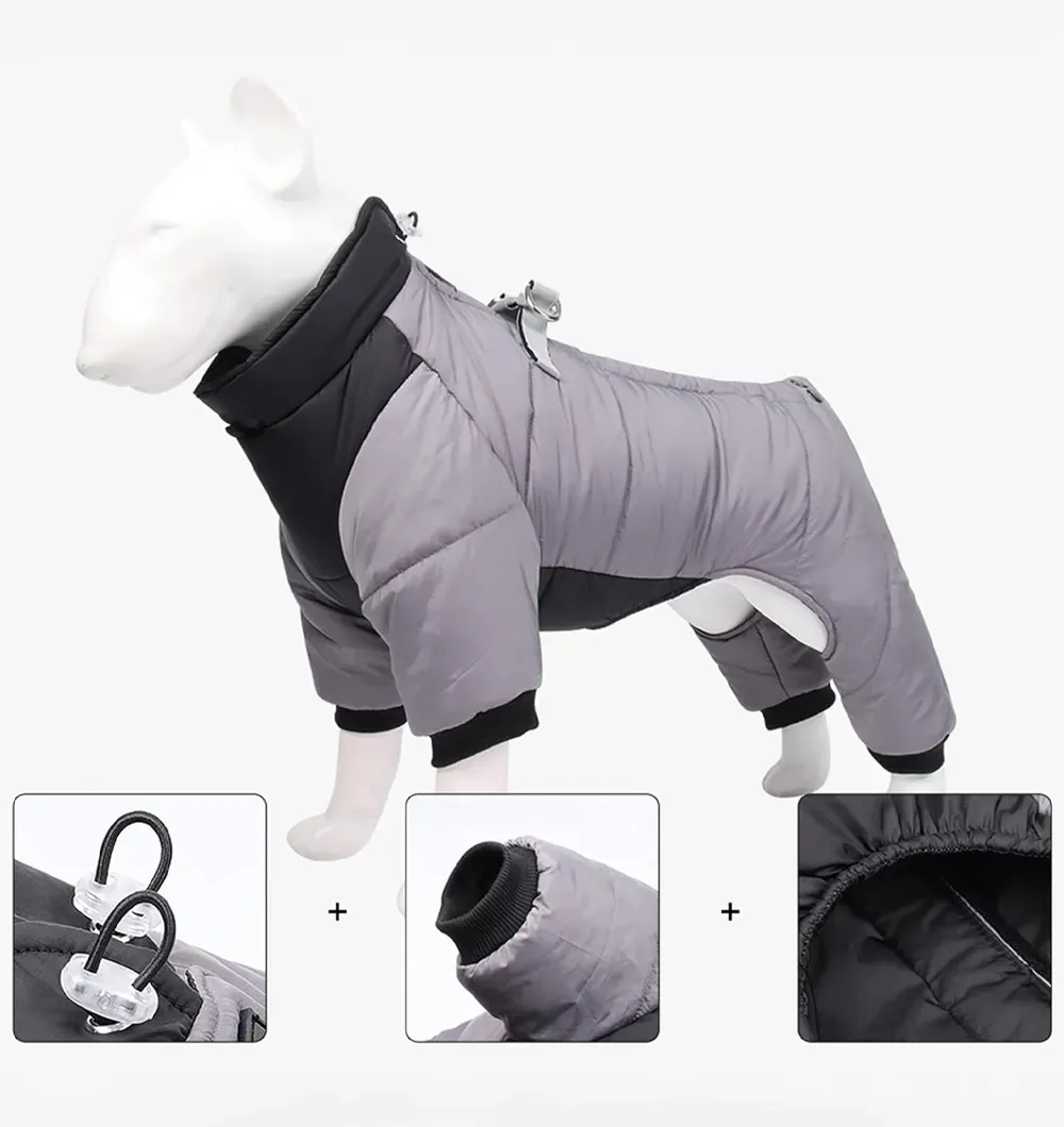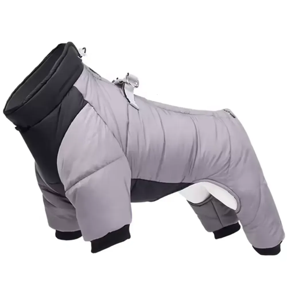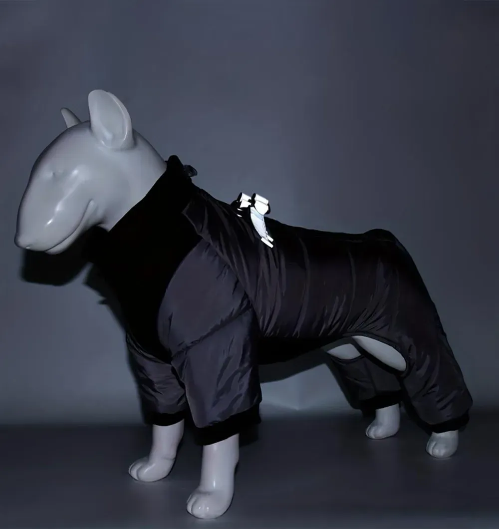 Теплая зимняя куртка для собак с длинными штанинами и короткими пришитыми ремешками на спине для крепления поводка.
