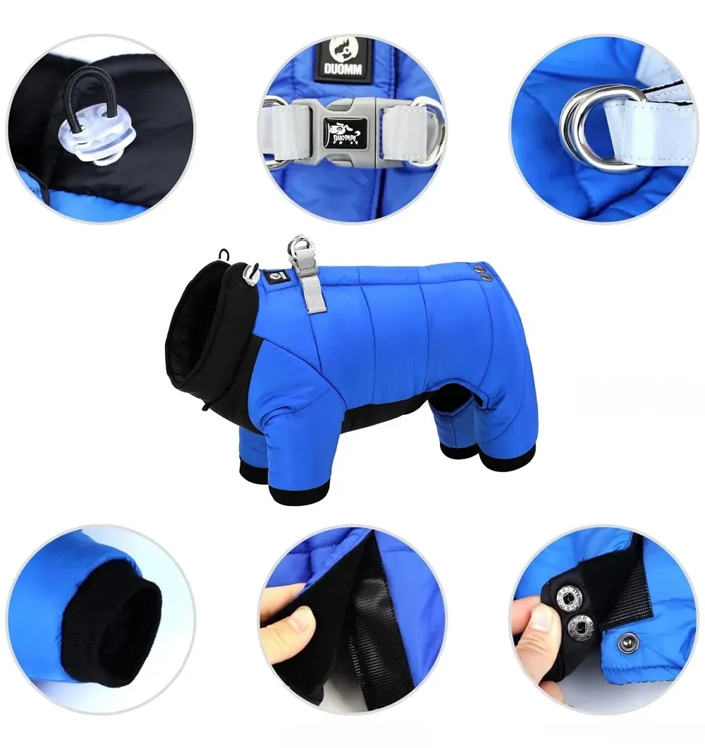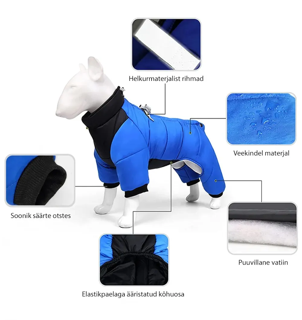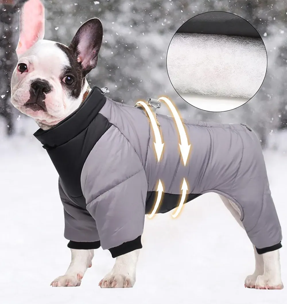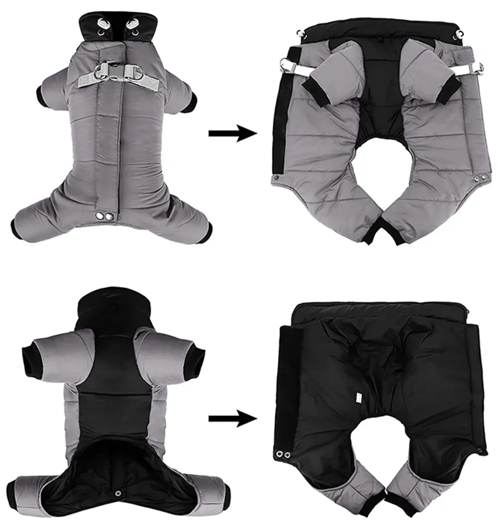 Теплая зимняя куртка для собак с длинными штанинами и короткими пришитыми ремешками на спине для крепления поводка.