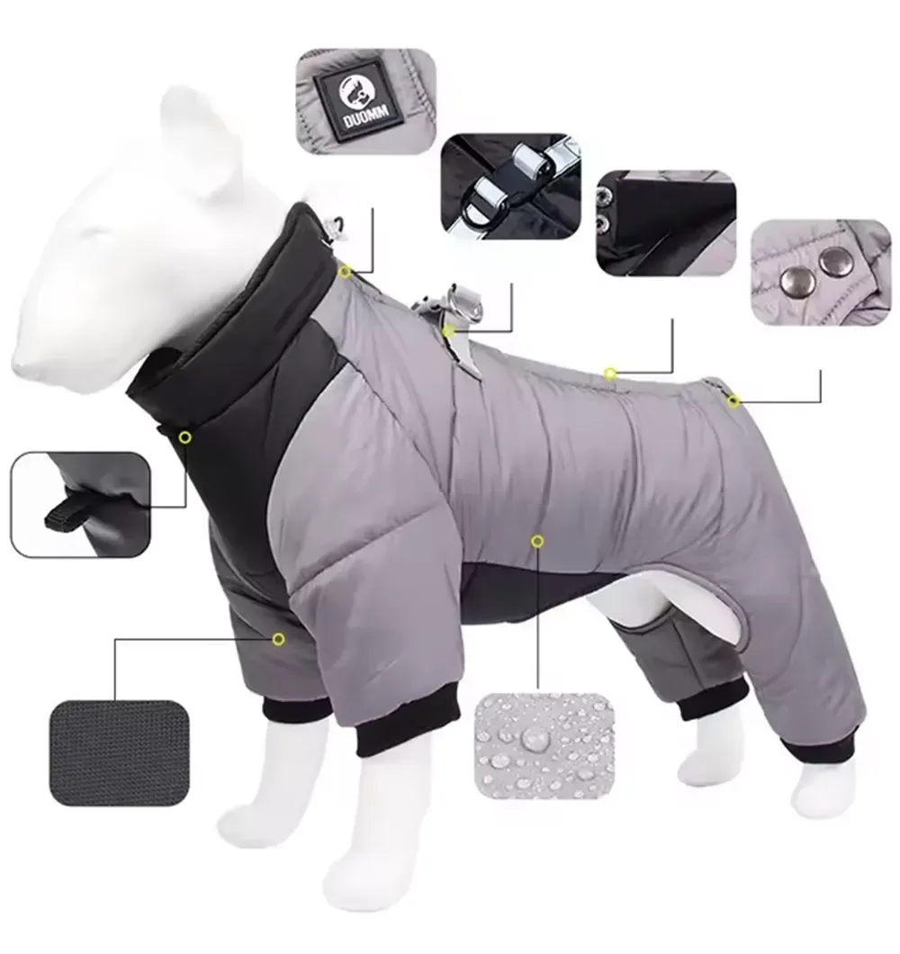 - Теплая зимняя куртка для собаки, которая защитит собаку от ветра, дождя и снега.