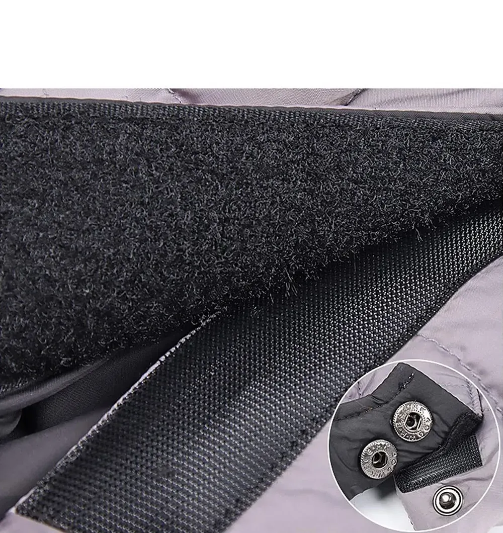 Куртка застегивается на спине под широкой защитной планкой на липучку. Липучка изготовлена из материала, который предотвращает прилипание к нему шерсти собаки.
