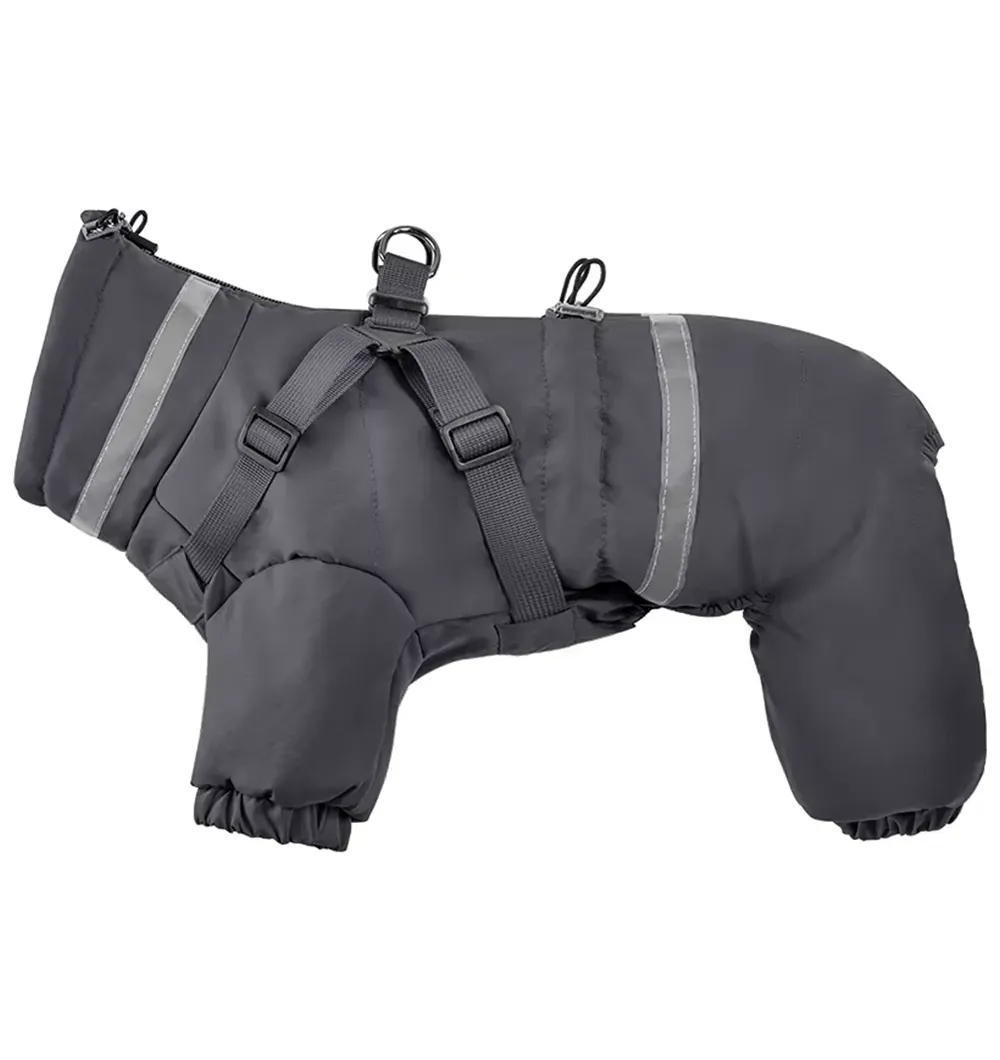 Зимняя куртка для собак с длинными штанинами и встроенной шлейкой.