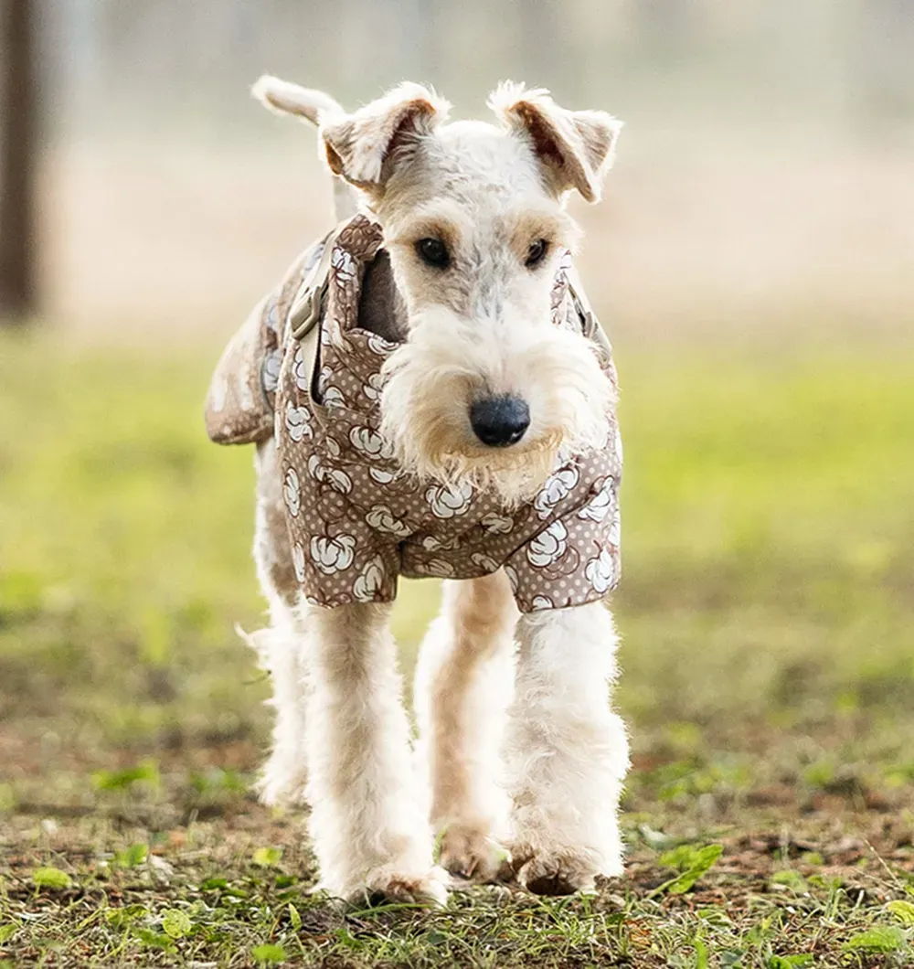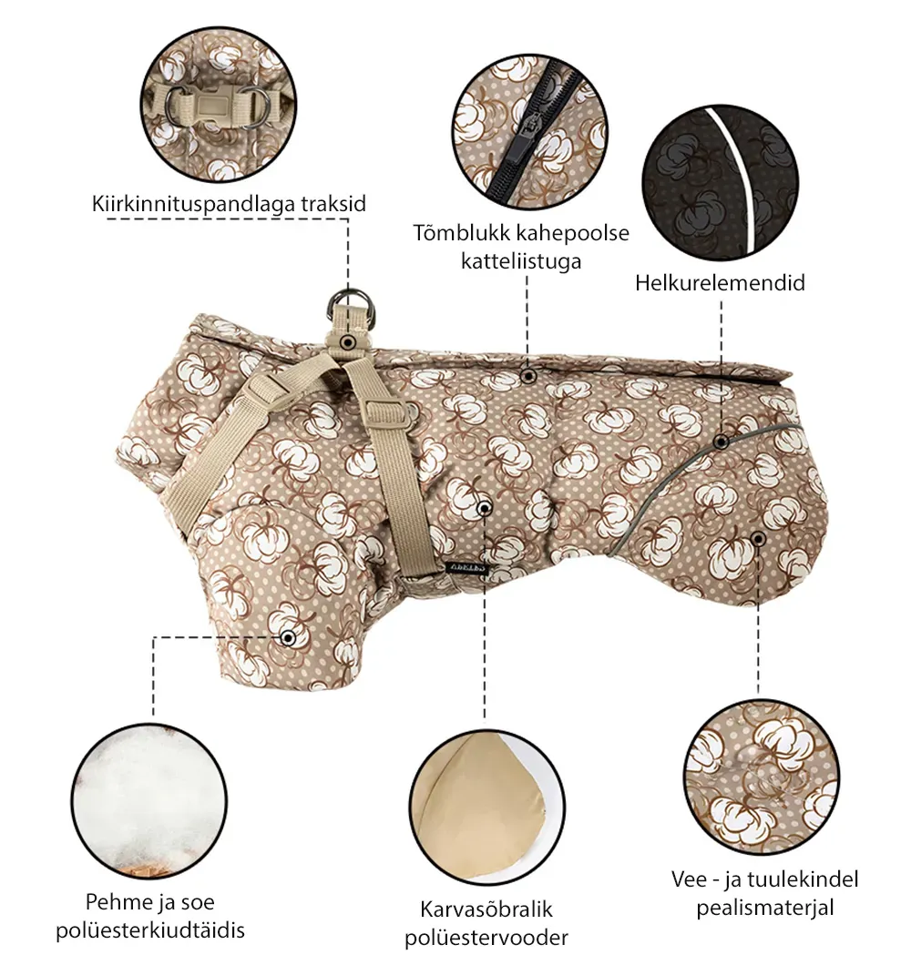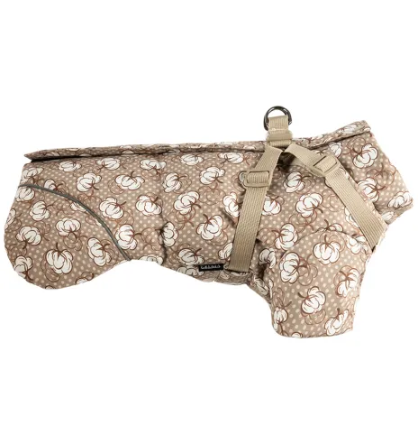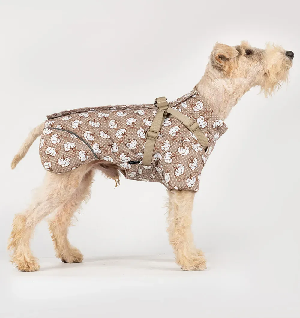 Зимняя куртка для собак с шлейкой, бежевая - с белыми хлопковыми цветами (VPETBR-D100)