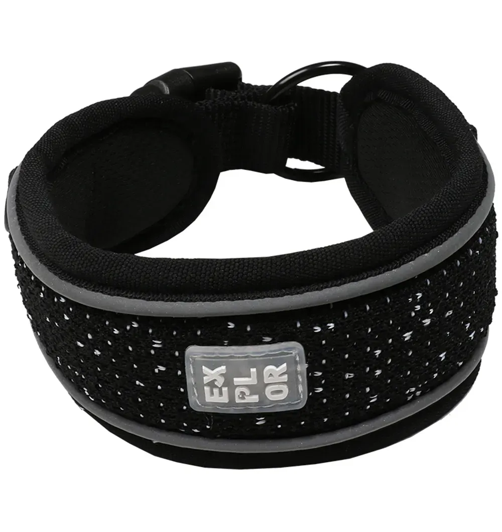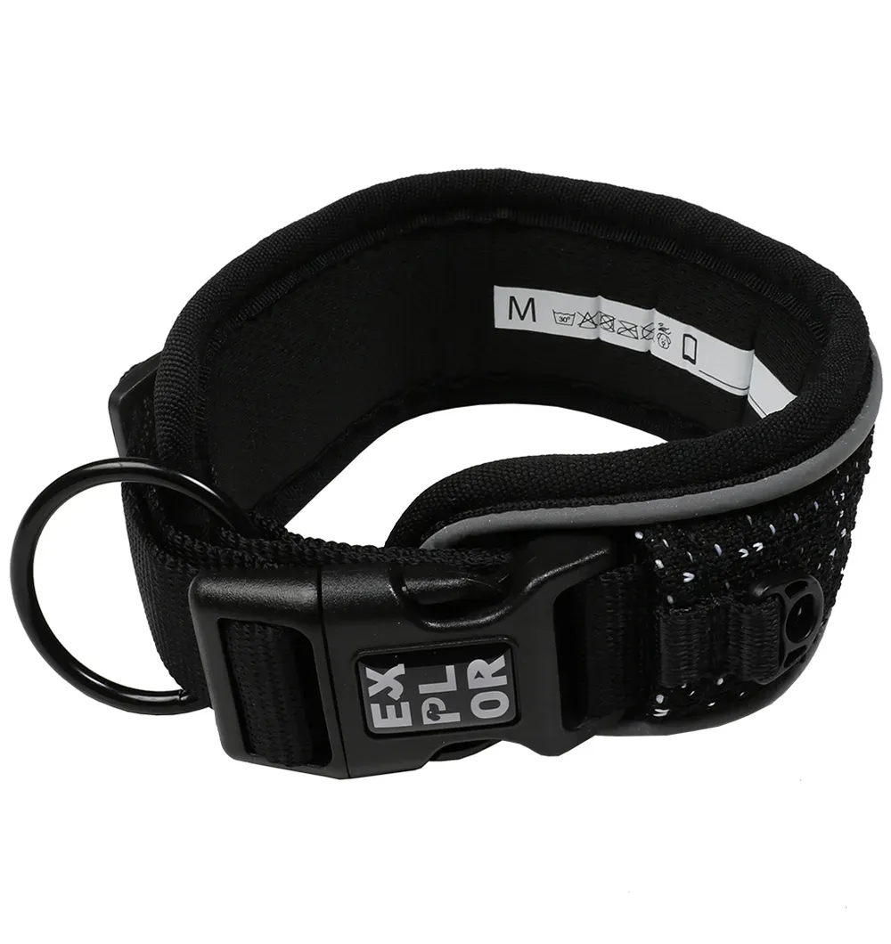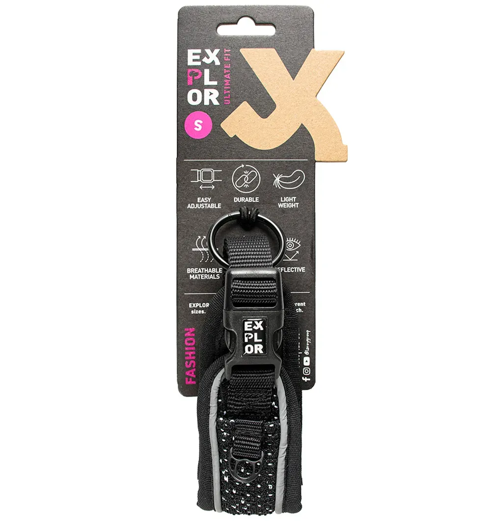 EXPLOR Ultimate Fit Control sarja koera kaelarihm on pehme, mugav ja lai. Valmistatud hästihingavast, elastsest kangast. Kaelarihma lai pind ja pikkuse reguleeritavus tagavad optimaalse survejaotuse koera kaela ümber juhul kui koer tõmbab või kui koera on vaja kontrollida. Klõpspannal pannakse enne sulgemist läbi metallrõngast, mistõttu pandlale avaldub vähem survet, kui metallrõnrõngast tõmmatakse. See teeb EXPLOR Ultimate Fit Control kaelarihma kasutamise eriti turvaliseks. Materjalid on hoolikalt valitud. Kaelarihm kuivab kiiresti, on vastupidav ja tänu helkurpaelale ümber kaelarihma tagab hea nähtavuse liikluses. Kaelarihma siseküljele saab kirjutada telefoninubri, samast on leitavad vajalikud hooldusjuhised.